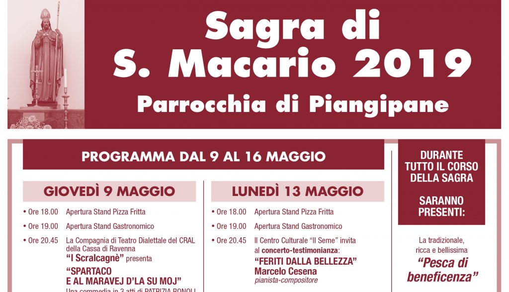Sarà una Sagra patronale di San Macario speciale quella di quest’anno a Piangipane (dal 9 al 16 maggio), perché si festeggiano i dieci anni di vita e attività del locale Centro Culturale “Il Seme” che, lungo questo decennale, ha promosso in parrocchia occasioni di incontro, confronto e condivisione su temi di attualità, con testimonianze, mostre, serate pubbliche.Il Centro quest’anno proporrà il concerto/testimonianza “Feriti dalla bellezza” del pianista e compositore Marcelo Cesena, lunedì 13 maggio alle 20.45 nella chiesa di Piangipane. Marcelo Cesena, compositore e pianista concertista ha vinto due volte il Brazilian International Press Award.