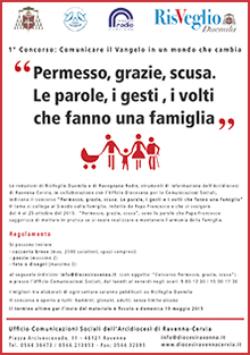 Le redazioni di RisVeglio Duemila e di Ravegnana Radio, strumenti di informazione dell’Arcidiocesi di Ravenna-Cervia, in collaborazione con l’Ufficio Diocesano per le Comunicazioni Sociali, indicono il concorso “Permesso, grazie, scusa. Le parole, i gesti e i volti che fanno una famiglia” Il tema si collega al Sinodo sulla famiglia, indetto da Papa Francesco e che si svolgerà dal 4 al 25 ottobre del 2015.  “Permesso, grazie, scusa”, sono le parole che Papa Francesco suggerisce di mettere in pratica se si vuole realizzare e mantenere l’armonia della famiglia.