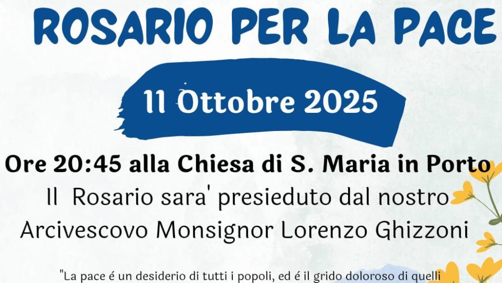 La diocesi di Ravenna-Cervia accoglie l’invito di Papa Leone XIV ad intensificare la preghiera per la pace, in modo particolare, con la recita del Rosario durante il mese di ottobre. Sabato 11, la nostra chiesa locale si ritroverà alle 20.45 a Santa Maria in Porto per la recita del Rosario presieduta dall’arcivescovo Lorenzo Ghizzoni.