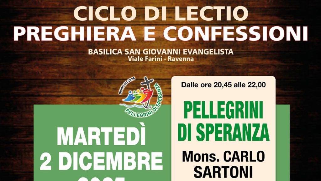 Giubileo 2025 News 19/11/2025 2 dicembre: Lectio Giubileo 2025 a San Giovanni Evangelista Ciclo di lectio, preghiera e confessioni Pellegrini di speranza ore 20.45-22.00 Basilica di San Giovanni Evangelista Locandina 2 dicembre Programma