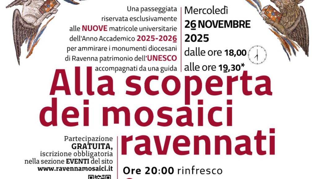 Una passeggiata riservata esclusivamente alle nuove matricole universitarie dell’Anno Accademico 2025-2026 per ammirare i monumenti diocesani di Ravenna patrimonio dell’UNECO accompagnati da una guida.