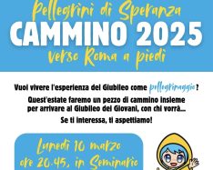 In Seminario alle 20.45 Vuoi vivere l’esperienza del Giubileo come pellegrinaggio? Quest’estate faremo un pezzo di cammino insieme per arrivare al Giubileo dei Giovani, con chi vorrà… Se ti interessa, ti aspettiamo!