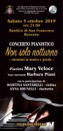 Sabato 5 ottobre 2019 ore 21.00 Basilica di San Francesco, Ravenna Concerto Pianistico Non solo notturno Emozioni in musica e parola Pianista Mary Veloce Voce narrante Barbara Piani con la partecipazione di: Martina Santarelli – violino Anna Brunelli – clarinetto Ingresso libero