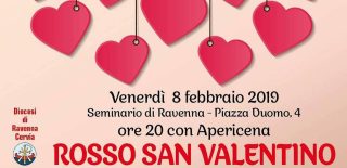 Venerdì 8 febbraio 2019 Seminario di Ravenna, Piazza Duomo, 4 Ore 20 con Apericena Rosso San Valentino La Festa degli Innamorati con la testimonianza di Giuseppe Spimpolo (Diocesi di Verona) e con la presenza del nostro Vescovo Lorenzo Ghizzoni Animazione per i bimbi Info: 347.7622354