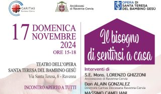 Il bisogno di sentirsi a casa Ore 15-18 Teatro dell’Opera Santa Teresa del Bambino Gesù Via Santa Teresa, 8. Ravenna Interventi di: Mons. Lorenzo Ghizzoni Don Alain Gonzalez Massimo Cameliani Dott.ssa Rina Giorgetti Suor Rosalba Scaturro Filippo Botti Amedeo Calzone Info e dettagli sul volantino
