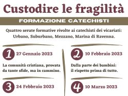 Arcidiocesi di Ravenna Cervia Ufficio Catechistico Diocesano – Servizio Diocesano Tutela Minori Custodire le fragilità FORMAZIONE CATECHISTI Quattro serate formative rivolte ai catechisti dei vicariati: Urbano, Suburbano, Mezzano, Marina di Ravenna. 27 Gennaio 2023 La comunità cristiana, provata da tante sfide, ma in cammino. 10 Febbraio 2023 Dalla parte dei bambini: il rispetto prima di […]