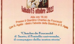 Sabato 15 ottobre 2022 alle ore 16 Nel 52° di Fondazione la Fraternità Jesus Caritas invita tutti a partecipare “Charles de Foucauld il Santo, il Fratello universale, il compagno della nostra storia” presso il Giardino Charles de Foucauld Quartiere S. Agata, dietro l’abside della Basilica di S. Agata Tutte le informazioni sul volantino