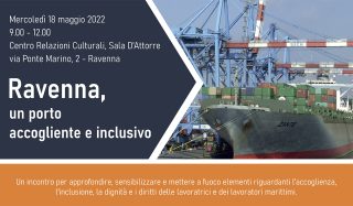 Mercoledì 18 maggio 2022 9.00 – 12.00 Centro Relazioni Culturali, Sala D’Attorre via Ponte Marino, 2 – Ravenna Ravenna, un porto accogliente e inclusivo Un incontro per approfondire, sensibilizzare e mettere a fuoco elementi riguardanti l’accoglienza, la dignità e i diritti delle lavoratrici e dei lavoratori marittimi. Il programma sul volantino
