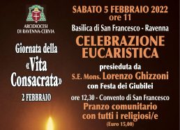 SABATO 5 FEBBRAIO 2022 ore 11 Basilica di San Francesco – Ravenna CELEBRAZIONE EUCARISTICA presieduta da S.E. Mons. Lorenzo Ghizzoni con Festa dei Giubilei ore 12,30 – Convento di San Francesco Pranzo comunitario con tutti i religiosi/e (Euro 15,00)