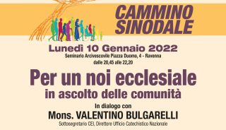 Scuola di Formazione Teologica “San Pier Crisologo” Lunedì 10 Gennaio 2022 Seminario Arcivescovile Piazza Duomo, 4 – Ravenna dalle 20,45 alle 22,20 Per un noi ecclesiale in ascolto delle comunità In dialogo con Mons. Valentino Bulgarelli, Sottosegretario CEI, Direttore Ufficio Catechistico Nazionale Tutte le informazioni sul volantino