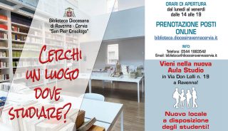 Lunedì 31 maggio riaprirà la Bibioteca Diocesana nella nuova sede di Via Don Angelo Lolli, 19 a Ravenna. La Sala studio è a disposizione degli studenti dal lunedì al venerdì dalle 14 alle 19. Per accedere sarà necessario prenotare i posti online a questo link. Per info: 0544.1883542 biblioteca@diocesiravennacervia.it biblioteca.diocesiravennacervia.it Biblioteca Diocesana “San Pier Crisologo” […]