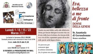 Scuola di Formazione Teologica “San Pier Crisologo” Lunedì 1, 8, 15, 22 marzo 2021 “Eva, bellezza a me di fronte” Donne della Genesi Sr. Anastasia di Gerusalemme Monaca carmelitana Le lezioni si terranno solo online, dalle 20.15 alle 21.30 Tutte le informazioni sul volantino