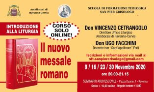Scuola di Formazione Teologica San Pier Crisologo Introduzione alla Liturgia Il nuovo messale romano Corso solo online Don Vincenzo Cetrangolo, Direttore Ufficio Liturgico Arcidiocesi Ravenna-Cervia Don Ugo Facchini, Docente Issr “Sant’Apollinare Forlì 9 / 16 / 23 / 30 novembre 2020 ore 20.00-21.15 Seminario Arcivescovile – Piazza Duomo, 4 – Ravenna Costo: € 15,00 online, […]