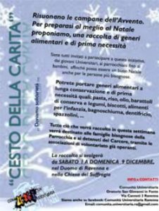 Cesto della Carità: 1-9 dicembre Doniamo solidarietà! Risuonano le campane dell’Avvento. Per prepararsi al meglio al Natale proponiamo, una raccolta di generi alimentari e di prima necessità. Siete tutti invitati a partecipare aquesta iniziativa, dai giovani Universitari , ai parrocchiani fino ai bambini, affinchè possa essere un buon Natale anche per le persone più […]