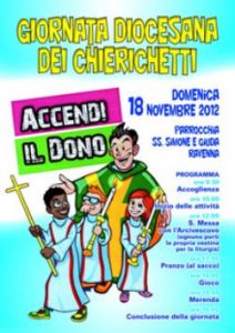 Giornata Diocesana Chierichetti 2012 Dal ‘RisVeglio Duemila’ N. 41/2012 Anticipiamo che si svolgerà domenica 18 novembre a partire dalle ore 9.30 la Giornata Diocesana dei Chierichetti; l’appuntamento è presso la Parrocchia dei Santi Simone e Giuda; avrà come titolo ‘Accendi il dono’. Dopo l’inizio delle attività (ore 10), alle ore 12 il nostro Arcivescovo celebrerà […]