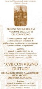 Mille anni di storia camaldolese negli archivi dell’Emilia-Romagna Nella giornata di giovedì 11 ottobre 2012, con inizio alle ore 9.30, avrà luogo alla Sala Don Minzoni del Seminario Arcivescovile, piazza Duomo 4, Ravenna, il convegno ‘ giornata di studio «Mille anni di storia camaldolese negli archivi dell’Emilia-Romagna», curata dalla Società di Studi Ravennati nell’ambito […]
