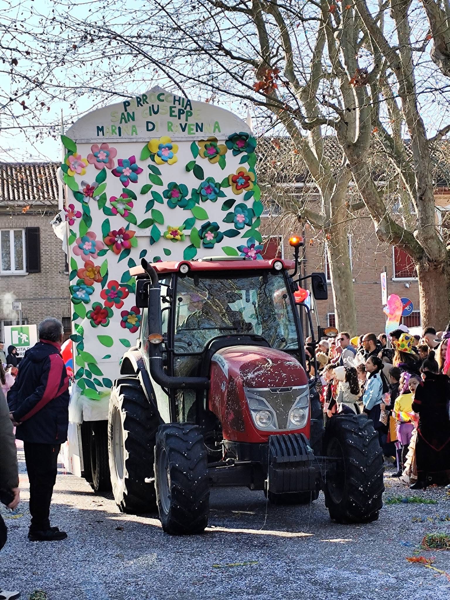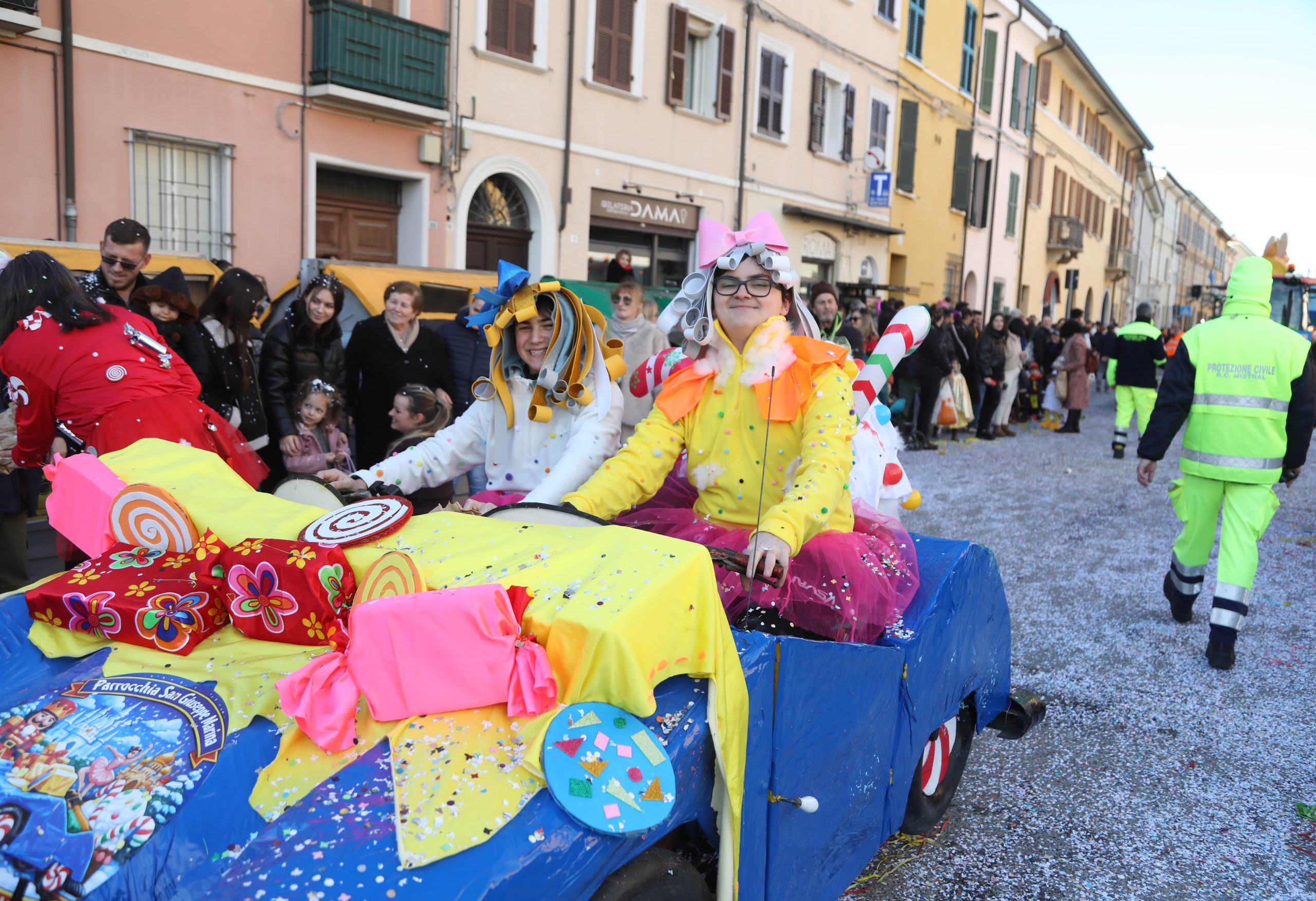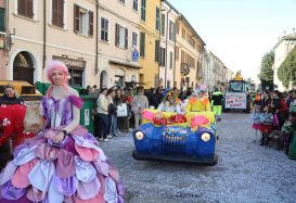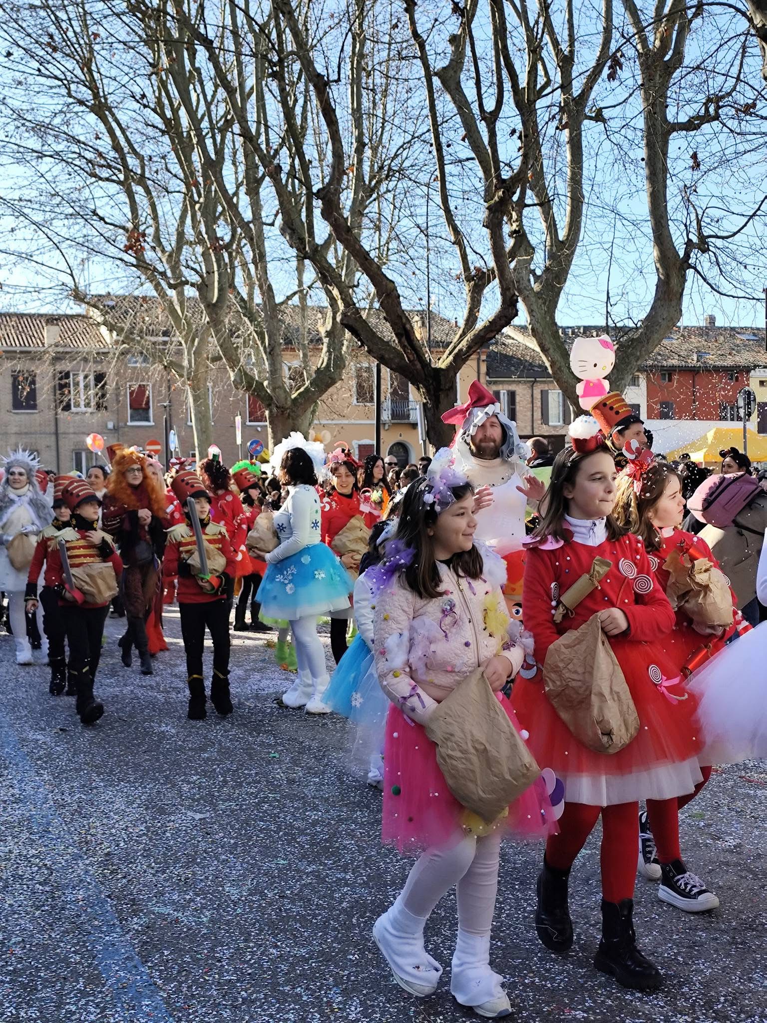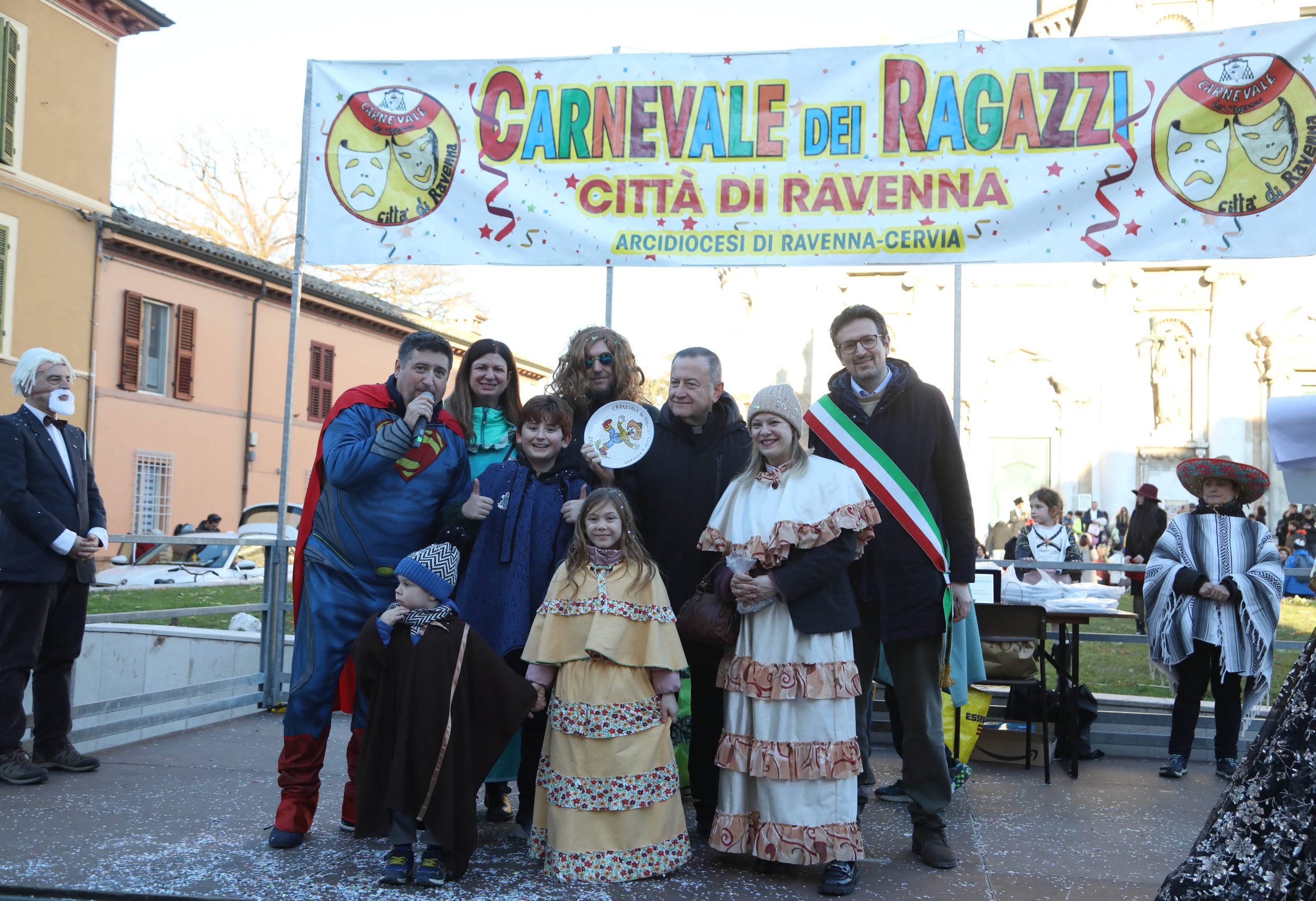15-02-2026-; ravenna via di roma sfilata carri di carnevale città di ravenna , parrocchie , vestiti , carri mascherati , diocesi - carnevale, vincitori parrocchia e caro di porto fuori , premio migliore maschera carlino roberta terragrossa di marina di ravenna , con vestito fata confetto