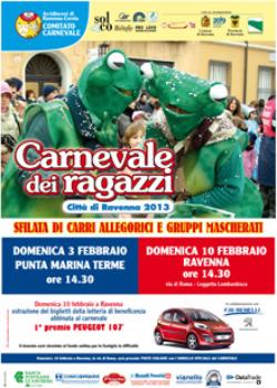 Le sfilate del ‘Carnevale dei ragazzi ‘ Città di Ravenna 2013‘, sono in programma domenica 3 febbraio a Punta Marina Terme e domenica 10 febbraio a Ravenna (via di Roma ‘ Loggetta Lombardesca), con inizio sempre alle ore 14.30.