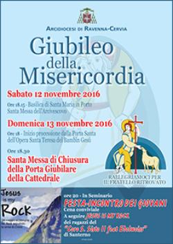 Chiusura del Giubileo della MisericordiaDal “RisVeglio Duemila” N. 41/2016 Sabato 12 e domenica 13 novembre si terranno le celebrazioni di chiusura delle tre Porte Sante della nostra diocesi. In particolare, sabato 12 alle 18.15 l’arcivescovo celebrerà la Santa Messa nella basilica di Santa Maria in Porto, sede di una delle tre Porte. Domenica 13 novembre invece, alle 18 partirà la processione dei fedeli dalla Porta Santa dell’Opera di Santa Teresa del Bambin Gesù. Alle 18.30 monsignor Lorenzo Ghizzoni presiederà la Santa Messa di chiusura della Porta Giubilare della Cattedrale.Farà seguito, alle 20 in Seminario, la Festa-incontro dei giovani che prevede la cena conviviale e lo spettacolo “Jesus is my rock” proposto dai ragazzi del coro “San Sisto II feat Edelweiss” di Santerno.