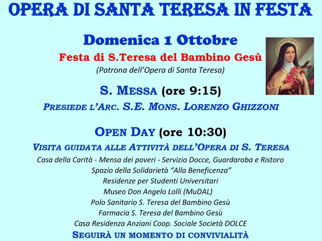 Tornano le Feste dell’Opera di Santa Teresa, quest’anno con una novità: il suo primo Open day. Domenica 1° ottobre, in occasione della Festa di Santa Teresa del Bambino Gesù, patrona della Fondazione, l’Arcivescovo S.E. Mons. Lorenzo Ghizzoni, alle ore 9:15 presiederà la S. Messa nella chiesa di Santa Teresa.