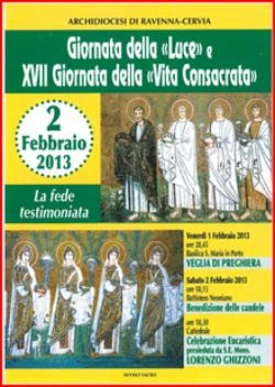 Sabato 2 febbraio alle ore 18.15 invece, in Cattedrale, l’Arcivescovo Mons. Luigi Ghizzoni presiederà la solenne Celebrazione Eucaristica in occasione della Giornata. Durante la Santa Messa saranno festeggiate alcune religiose che celebrano, in questo 2013, particolari anniversari di Professione; ne pubblichiamo i nomi.