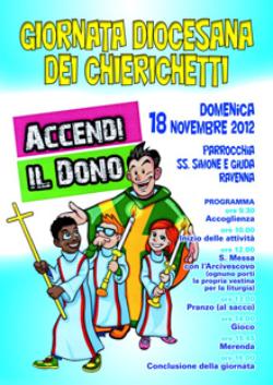 Anticipiamo che si svolgerà domenica 18 novembre a partire dalle ore 9.30 la Giornata Diocesana dei Chierichetti; l’appuntamento è presso la Parrocchia dei Santi Simone e Giuda; avrà come titolo ‘Accendi il dono’. Dopo l’inizio delle attività (ore 10), alle ore 12 il nostro Arcivescovo celebrerà la Santa Messa (ogni chierichetto porti la propria veste per la liturgia); alle ore 13 è previsto il pranzo al sacco, seguito dal gioco e dalla merenda (conclusione ore 16).