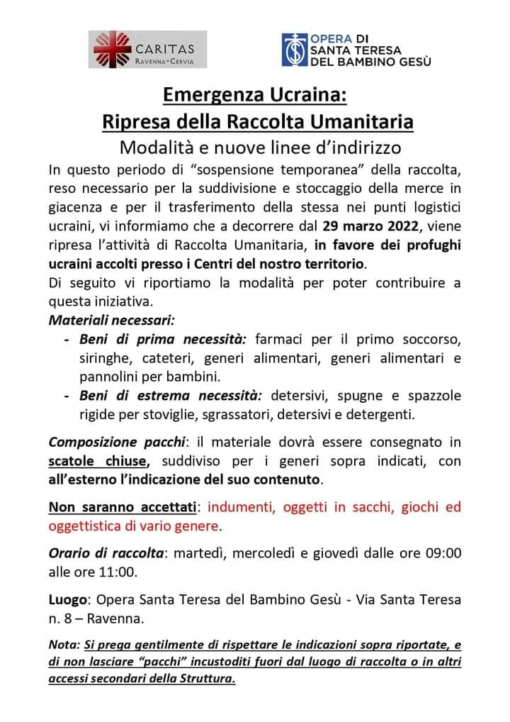 “La diocesi di Ravenna-Cervia, insieme con le comunità della diocesi – spiega il direttore don Alain Gonzalez Valdès – segue con attenzione e preoccupazione la situazione della popolazione Ucraina, duramente colpita della guerra con la Russia. Oltre alla preghiera incessante affinché il Signore Gesù, principe della Pace, doni la sua pace e la riconciliazione in questa difficile vicenda, ci rendiamo disponibili, attraverso la Caritas ad essere ponte tra la comunità di Ravenna-Cervia e la popolazione colpita. Inoltre, chiediamo ai parroci, alle parrocchie, alle associazioni laicali, alle congregazioni religiose, alle famiglie e a tutti i fedeli che fossero disponibili per l’accoglienza di profughi, di inviare la propria disponibilità a info@caritasravenna.it”