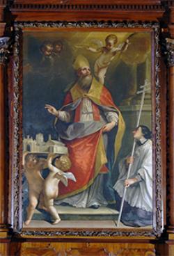 Sempre di Filippo Pasquali è la grande tela nella sacrestia. Qui il Protovescovo non appare più giovane come nell’opera precedente, bensì viene raffigurato come un vegliardo, vestito con gli abiti pontificali, il piviale e la stola rossi, il colore usato dalla liturgia per evocare il martirio, momento glorioso richiamato anche dal putto che regge la palma e pone la corona sul capo del Santo. Ai piedi di Apollinare sono due putti che reggono il modellino della città di Ravenna: egli lo benedice e, in questo gesto, si rende manifesta la sua intercessione, nei secoli, per la chiesa da lui fondata.