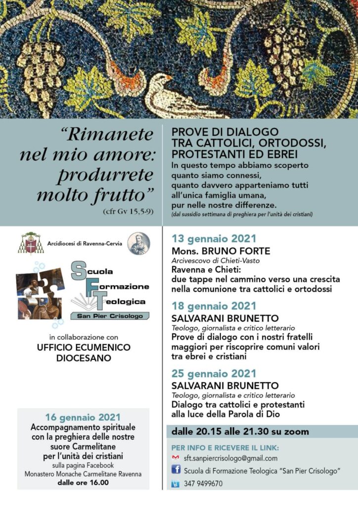 Il prof. Brunetto Salvarani teologo, giornalista e critico letterario, in modo chiaro e coinvolgente presenterà Prove di dialogo con i nostri fratelli maggiori per riscoprire comuni valori tra ebrei e cristiani. Vi aspettiamo!