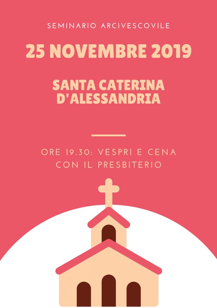 News 10 Novembre 2019 Lunedì 25 novembre: Santa Caterina d’Alessandria Seminario Arcivescovile Lunedì 25 novembre 2019 Santa Caterina d’Alessandria Ore 19.30: Vespri e cena con il presbiterio