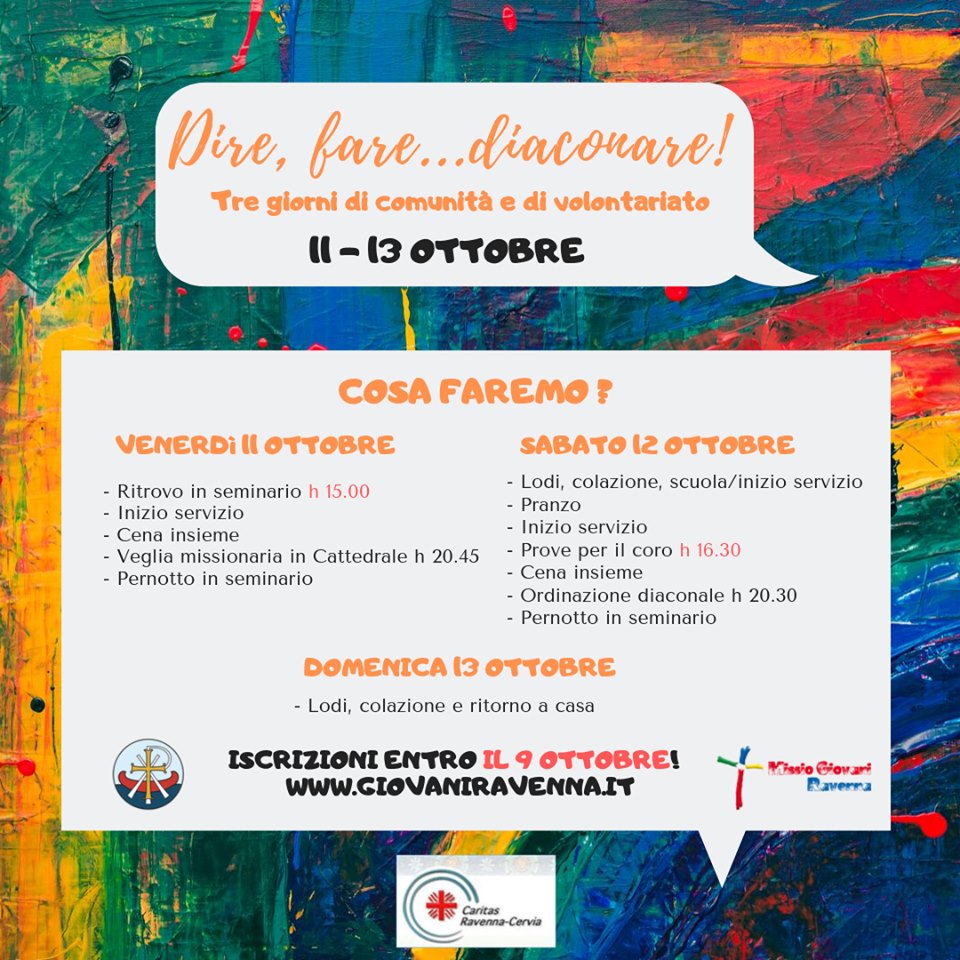 Sabato 12 ottobre sarà dedicato all’attività di servizio (alla mattina chi deve andrà a scuola e potrà tornare per il pranzo) e, per coloro che animeranno la S.Messa, alle prove del coro (dalle 16.30 in Cattedrale). Alle 20.30 ci sarà in Cattedrale l’ordinazione diaconale.