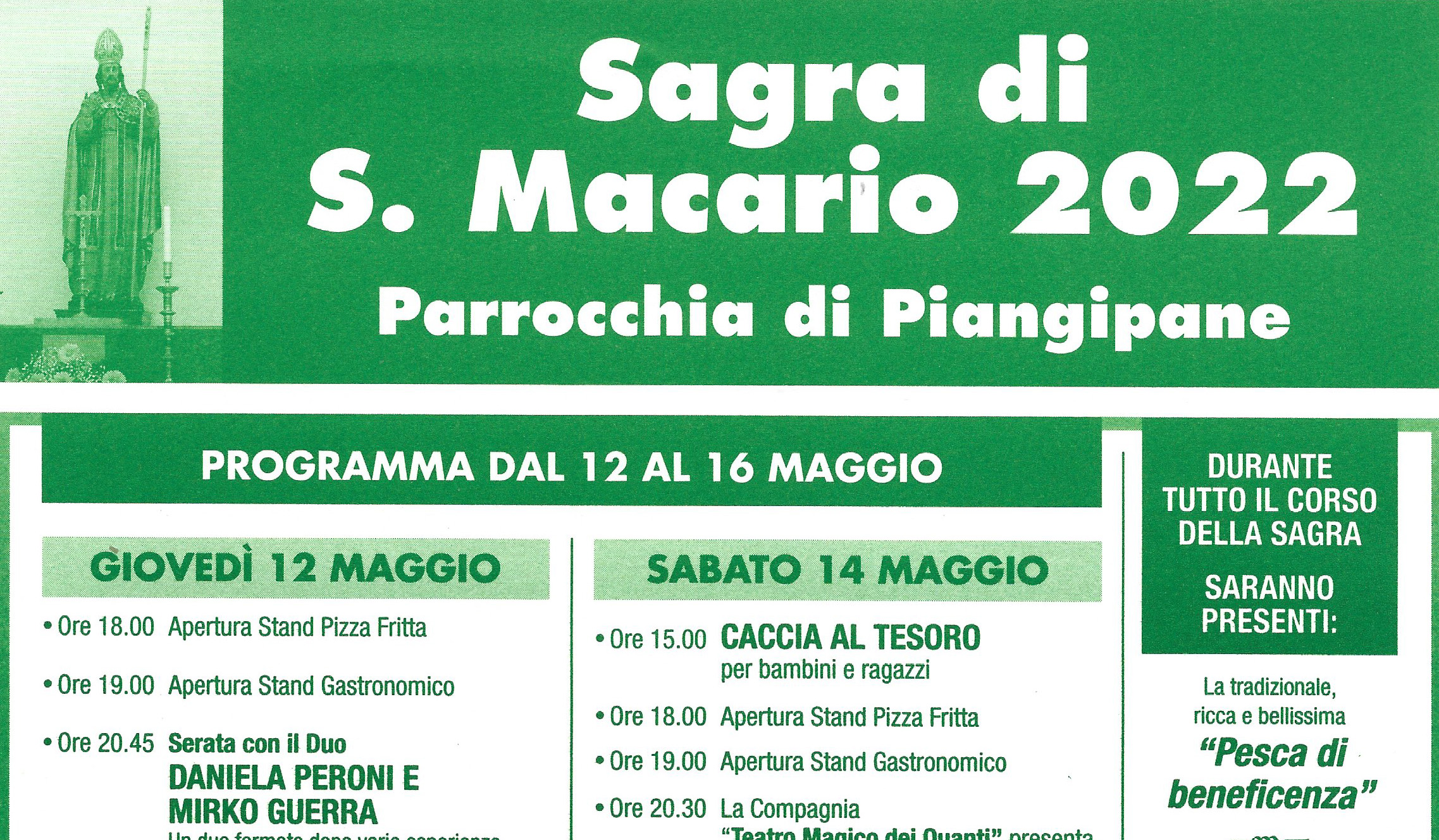 15 Marzo 2022 admindiocesi 12-16 maggio: Sagra di San Macario a Piangipane Parrocchia di Piangipane Da giovedì 12 a lunedì 16 maggio a Piangipane si svolgerà la tradizionale Sagra di San Macario. Programma e info sul volantino FacebookTwitterLinkedinPinterestPrintEmailWhatsapp Programma