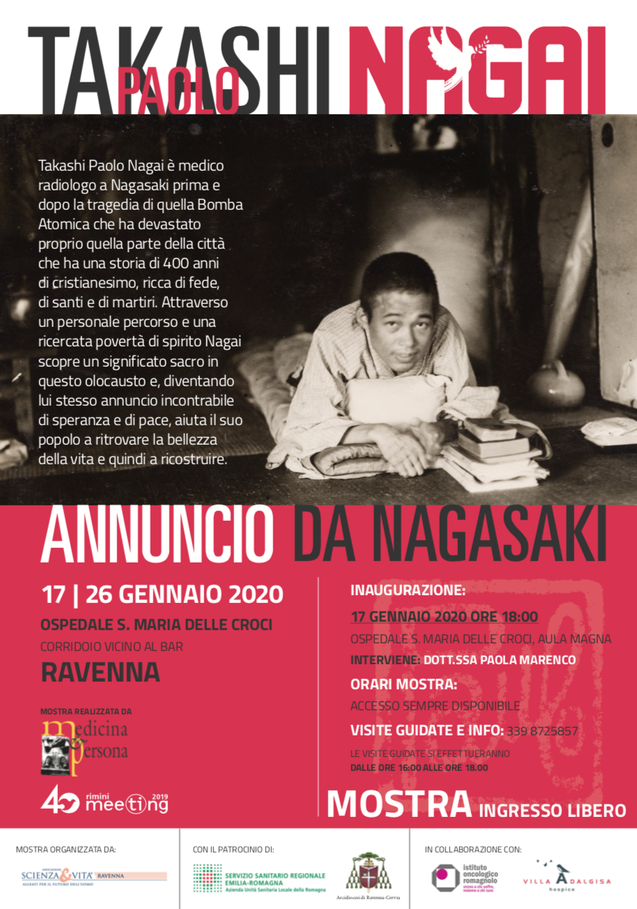 Dal 17 al 26 gennaio, presso l’Ospedale Santa Maria delle Croci di Ravenna, sarà possibile visitare la mostra dedicata a Takashi Paolo Nagai, medico radiologo a Nagasaki prima e dopo la tragedia di quella bomba atomica che ha devastato proprio quella parte della città che ha una storia di 400 anni di cristianesimo, ricca di fede, di santi e di martiri.