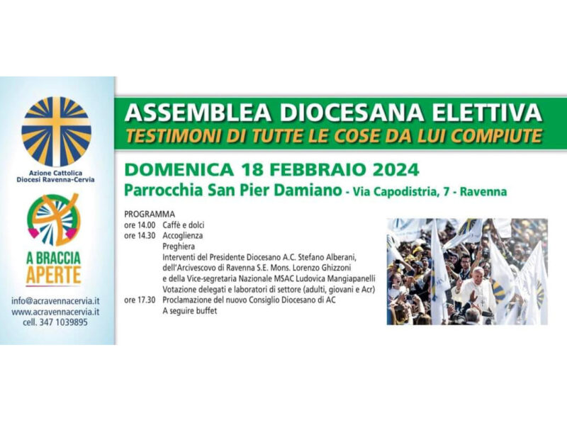 7 Novembre 2023 admindiocesi 18 febbraio: Assemblea Diocesana Elettiva AC Dopo tre anni, l’AC di Ravenna-Cervia fa verifica e riparte nell’Assemblea diocesana domenica 18 Febbraio: il racconto di un triennio un passo nel cammino della chiesa uno sguardo sul futuro Info e dettagli sul volantino FacebookTwitterLinkedinPinterestPrintEmailWhatsapp Volantino
