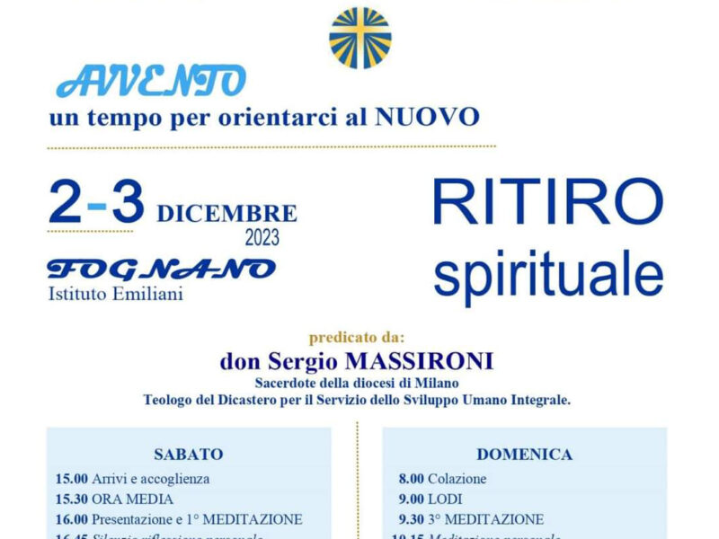 14 Ottobre 2023 admindiocesi 2-3 dicembre: AC, Ritiro di Avvento a Fognano Gli esercizi spirituali di Avvento, dopo qualche anno, tornano a tenersi nel suggestivo Istituto Emiliani di Fognano (Brisighella ). Meditazioni di don Sergio Massironi della diocesi di Milano. Sono aperte le iscrizioni. Nel volantino le indicazioni AC Ravenna-Cervia FacebookTwitterLinkedinPinterestPrintEmailWhatsapp Volantino