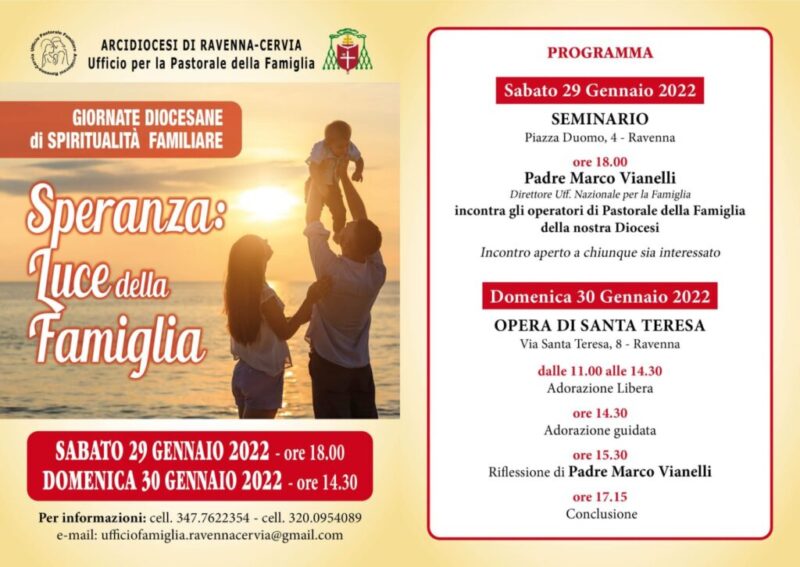 23 Novembre 2021 admindiocesi 29-30 gennaio: Giornate diocesane di spiritualità familiare Sabato 29 e domenica 30 gennaio 2022 incontri per gli operatori di pastorale della famiglia e per chiunque sia interessato. Tutte le informazioni sul volantino FacebookTwitterLinkedinPinterestPrintEmailWhatsapp Volantino