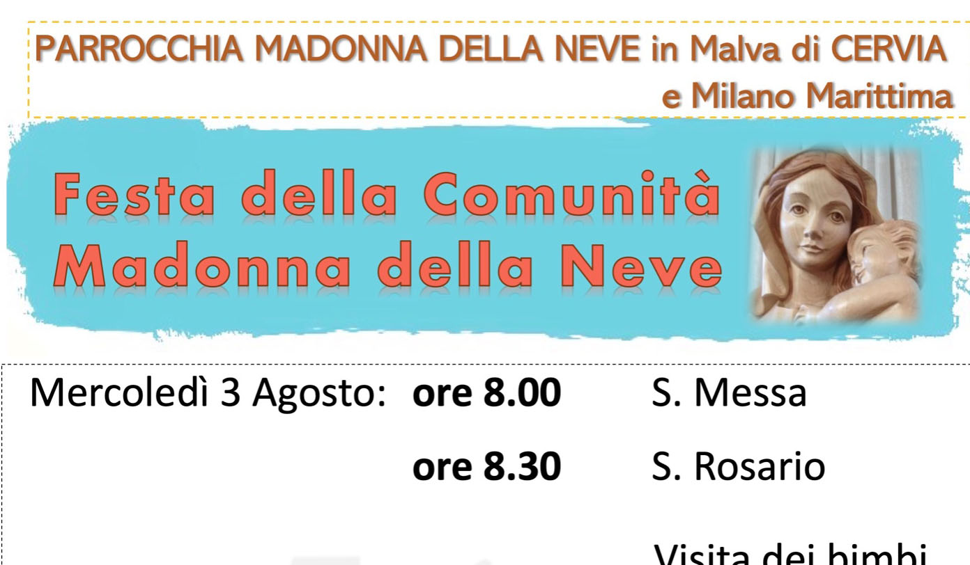 25 Marzo 2022 admindiocesi 3-5 agosto: Festa della Madonna della Neve a Malva Parrocchia Madonna della Neve in Malva di Cervia e Milano Marittima Da mercoledì 3 a venerdì 5 agosto Festa della Comunità Madonna della Neve Il programma sul volantino FacebookTwitterLinkedinPinterestPrintEmailWhatsapp Volantino