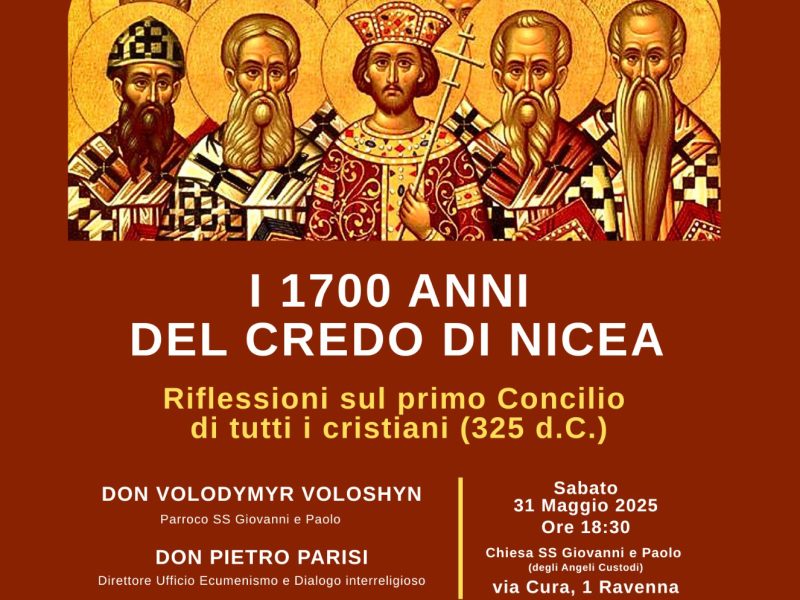 Partendo dalle parole di Papa Francesco che, in una delle ultime udienze del suo Pontificato definì il Concilio di Nicea “un evento importantissimo la cui memoria può alimentare la volontà di una maggiore testimonianza e comunione”, il sacerdote ucraino Don Volodymir Voloshin, parroco di SS. Giovanni e Paolo, e Don Pietro Parisi, direttore dell’ Ufficio ecumenico della Diocesi ravennate, rifletteranno sul contesto storico del IV secolo d.C., con la conversione al Cristianesimo dell’ imperatore Costantino e la formulazione della dottrina ariana, e sulla ricerca dell’ ecumenismo nell’attualità come impegno pastorale. In dialogo con loro Valerio Acri, autore del libro “San Basilio Magno ponte tra Oriente e Occidente” (Velar Editrice 2023), che illustrerà le figure di Sant’Atanasio e San Basilio come Padri della Chiesa e strenui difensori del Credo di Nicea.