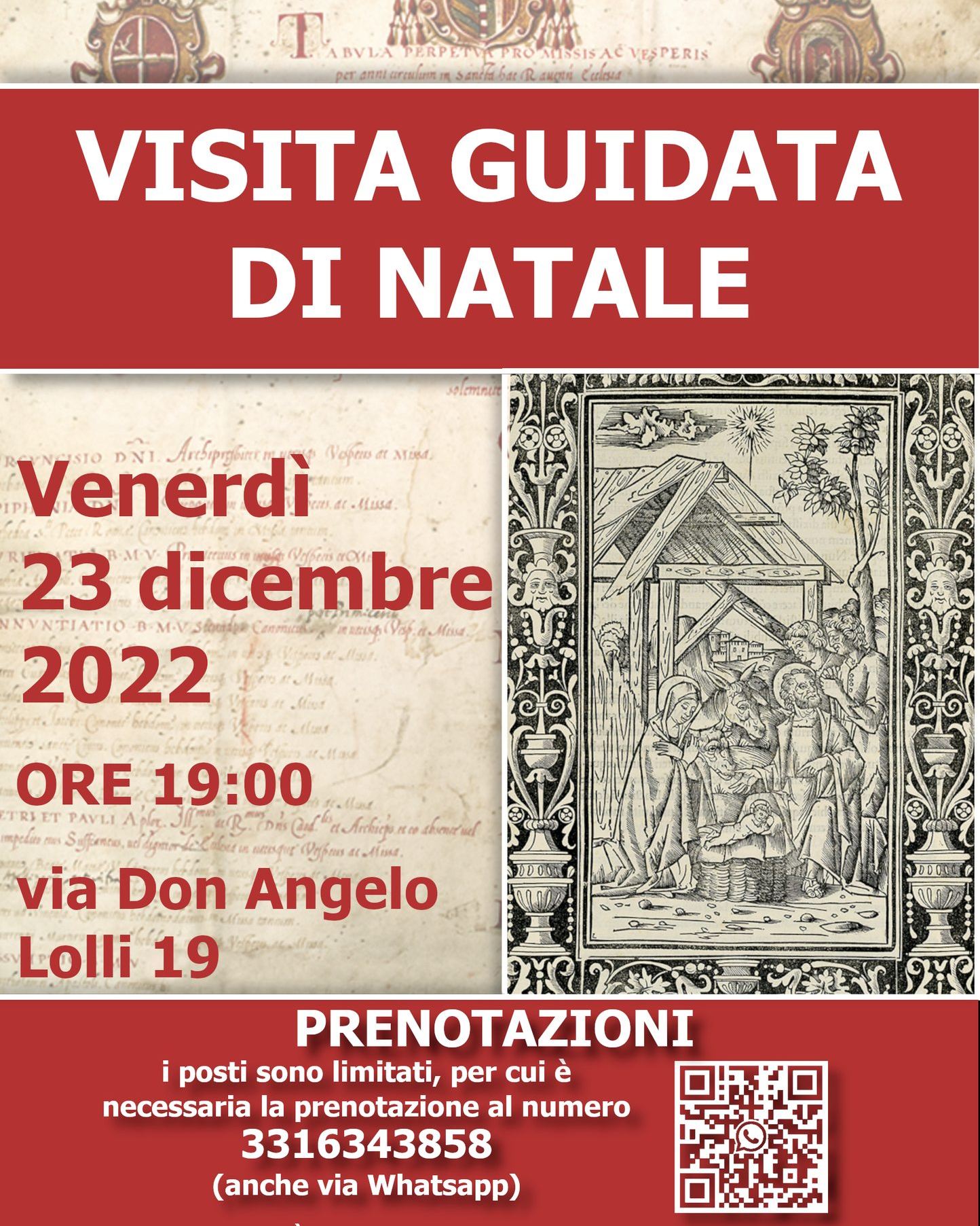 Prima di salutarci per le festività natalizie, venite ad ammirare alcuni dei tesori conservati nell’archivio; vi aspettiamo Venerdì 23 dicembre alle ore 19:qui nella nostra sede di via Don Angelo Lolli 19 per una visita guidata, totalmente gratuita, della durata di circa un’ora.