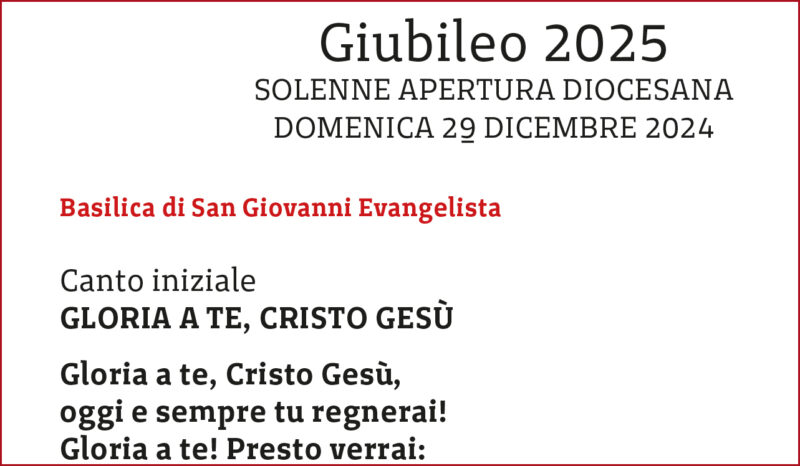 Giubileo 2025 SOLENNE APERTURA DIOCESANA DOMENICA 29 DICEMBRE 2024 Canto iniziale GLORIA A TE, CRISTO GESÙ Gloria a te, Cristo Gesù, oggi e sempre tu regnerai! Gloria a te! Presto verrai: sei speranza solo tu! (…)