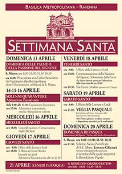 Settimana Santa 2014 – SS. Messe Basilica Metropolitana Domenica 13 aprile Domenica delle Palme o della Passione del Signore SS. Messe: ore 8.00 ‘ 10.00 ‘ 11.30 ‘ 18.30 ore 10.00: Processione con l’ulivo benedetto dal Seminario alla Metropolitana dove l’Arcivescovo celebrerà la S. Messa Mercoledì 16 aprile Mercoledì Santo ore 18.00: Concelebrazione e Consacrazione degli Oli Santi Venerdì 18 aprile … Continue reading Settimana Santa 2014 – SS. Messe Basilica Metropolitana