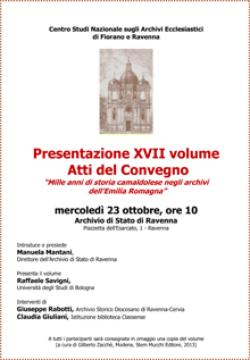 Presentazione del XVII volume degli atti del Convegno: ‘Mille anni di storia camaldolese negli archivi dell’Emilia-Romagna’ Mercoledì 23 ottobre p.v. presso la sede dell’Archivio di Stato di Ravenna, Piazzetta dell’Esarcato 1, alle ore 10.00, si terrà la presentazione del XVII volume degli atti del Convegno «Mille anni di storia camaldolese negli archivi dell’Emilia-Romagna», a cura di G. Zacchè, Modena 2013. Presenta il volume … Continue reading Presentazione del XVII volume degli atti del Convegno: ‘Mille anni di storia camaldolese negli archivi dell’Emilia-Romagna’
