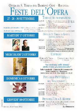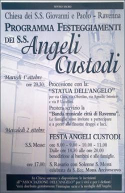 Festa dei Ss. Angeli Custodi Dal ‘RisVeglio Duemila’ N. 35/2013 Torna a Ravenna, presso la Chiesa dei Santi Giovanni e Paolo, la Festa dei Santissimi Angeli Custodi. Il programma è il seguente. Martedì 1° ottobre: ore 20.30, Processione con la ‘Statua dell’Angelo’ per via Cura, via Oberdan, via Agnello Istorico e via P. Uccellini; presterà servizio la ‘Banda musicale città di Ravenna’. … Continue reading Festa dei Ss. Angeli Custodi