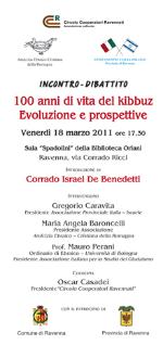 Incontro sul kibbuz Dal ‘RisVeglio Duemila’ N. 10/2011 L’Amicizia Ebraico-Cristiana della Romagna, il Circolo cooperatori Ravennati e l’Associazione Italia-Israele (Provincia di Ravenna) promuovono un incontro-dibattito sul tema ‘100 anni di vita del kibbuz. Evoluzione e prospettive’. L’appuntamento è per venerdì 18 marzo alle ore 17.30 presso la Sala ‘Spadolini’ della Biblioteca Oriani, in via Corrado Ricci a Ravenna. Dopo l’introduzione di Corrado Israele De Benedetti, … Continue reading Incontro sul kibbuz