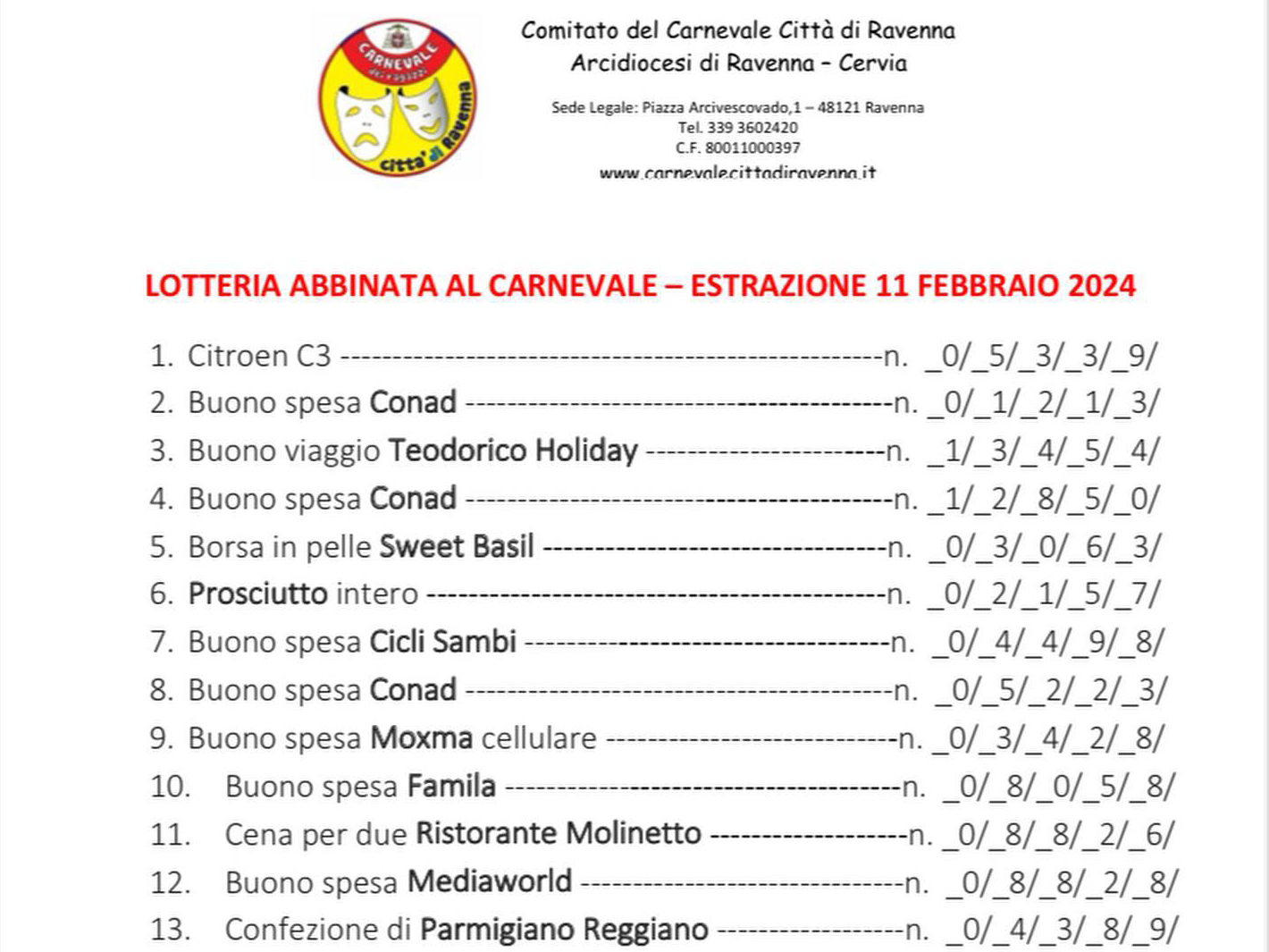 1 Febbraio 2024 admindiocesi Carnevale 2024: i biglietti vincenti Ecco i numeri vincenti della Lotteria di Beneficienza Ricordiamo che ci sono 60 giorni di tempo per ritirare i premi, telefonando al numero 339.3602420 FacebookTwitterLinkedinPinterestPrintEmailWhatsapp Carnevale 2024: i biglietti vincenti