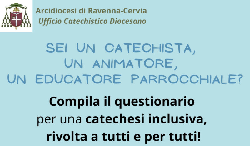 25 Agosto 2022 admindiocesi Catechesi inclusiva: compila il questionario entro l’11 dicembre Ufficio Catechistico Diocesano Sei un catechista, un animatore, un educatore parrocchiale? Compila il questionario per una catechesi inclusiva, rivolta a tutti e aperta a tutti! Entro l’11 dicembre 2022 FacebookTwitterLinkedinPinterestPrintEmailWhatsapp Locandina, link e QR code per accedere al questionario