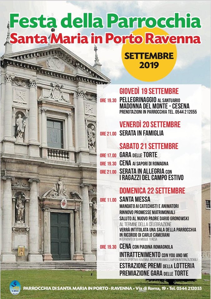 La festa parrocchiale a Santa Maria in Porto, inizierà venerdì 19 con un pellegrinaggio alla Madonna del Monte, prevede un momento davvero speciale domenica 22 settembre quando, dopo la Messa delle 11, verrà intitolata una sala della parrocchia in ricordo di Carlo Camerani, già presidente del Movimento per la Vita di Ravenna, interverrà la moglie Teresa.