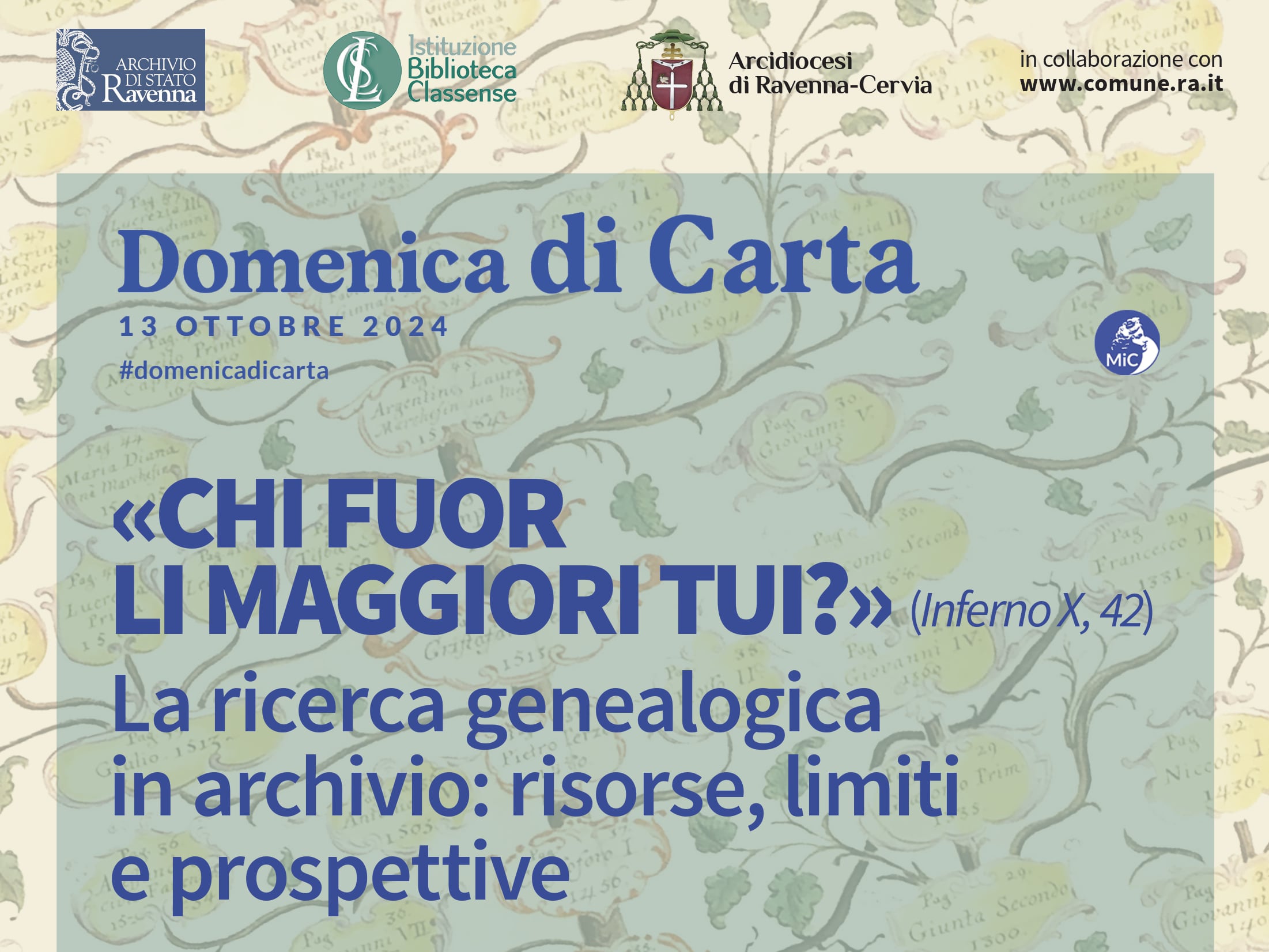 Interverranno Michela Dolcini (Archivio di Stato), Claudia Foschini (Istituzione Biblioteca Classense, Archivio storico comunale di Ravenna), Emanuela Bottoni e Francesca Bezzi (Archivio Storico Diocesano) e Laura Montanari (amministrazione comunale di Ravenna, ufficio anagrafe), e illustreranno le risorse disponibili per le ricerche genealogiche, le modalità di accesso, i progetti di digitalizzazione, e tutto quanto occorre sapere per intraprendere un viaggio alla scoperta dei propri antenati.