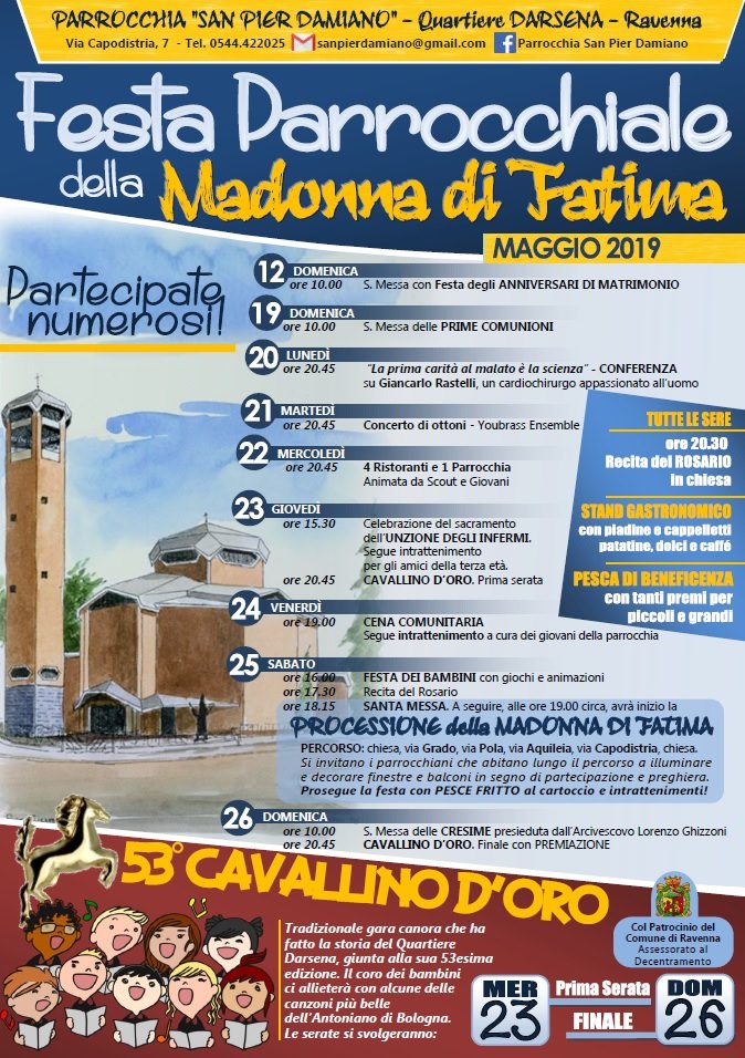 Invece sabato 25 alle 19 inizierà la processione con l’effige della Madonna di Fatima. Nel corso della Festa si tiene la 53^ edizione del Cavallino D’oro, gara canora dei bambini.