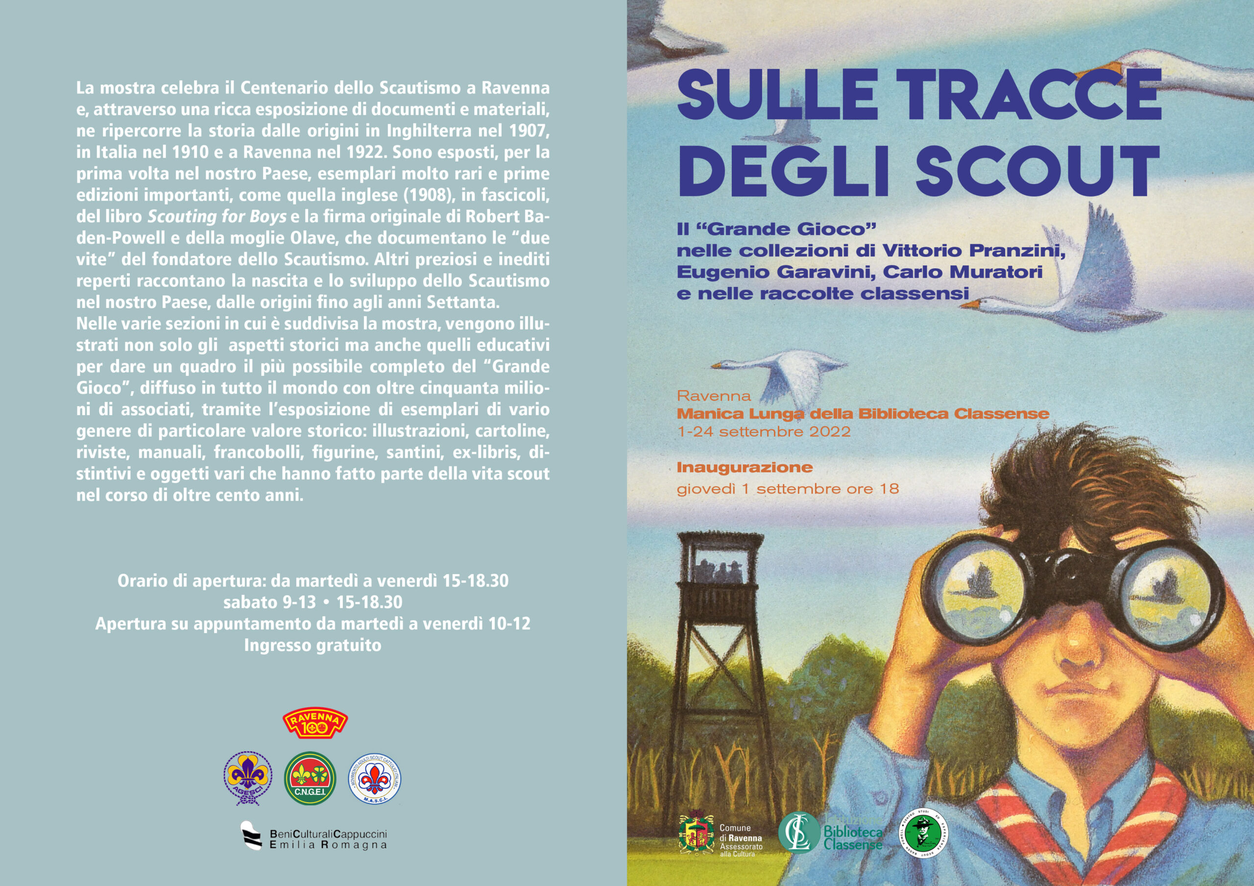 La mostra celebra il Centenario dello Scautismo a Ravenna e, attraverso una ricca esposizione di documenti e materiali, ne ripercorre la storia dalle origini in Inghilterra nel 1907, in Italia nel 1910 e a Ravenna nel 1922. Sono esposti, per la prima volta nel nostro Paese, esemplari molto rari e prime edizioni importanti, come quella inglese (1908), in fascicoli, del libro Scouting for Boys e la firma originale di Robert Baden-Powell e della moglie Olave, che documentano le “due vite” del fondatore dello Scautismo. Altri preziosi e inediti reperti raccontano la nascita e lo sviluppo dello Scautismo nel nostro Paese, dalle origini fino agli anni Settanta.